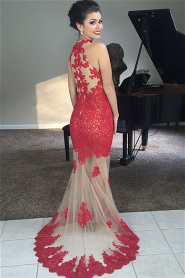 Burgundy Lace and Tulle Prom Gowns Illusion Neckline Sweep Train pst0029