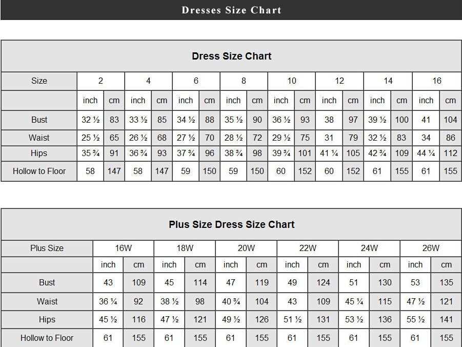 Size 16(inch) Bust:39.5 Waist:34 Hips:44.25 Hollow to Floor:61